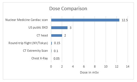 La dosis de radiación constituye la otra parte de la ecuación. Con los escaneos de TC, los técnicos pueden protegerse o limitar las dosis saliendo de la sala o colocándose detrás de una barrera durante el procedimiento. Los pacientes, como sujetos sometidos al procedimiento, son los que reciben la exposición. Sin embargo, si bien un escaneo de TC suma a la carga de la dosis, pongamos la cuestión en perspectiva. La cantidad de radiación “de fondo” a la que estamos todos expuestos en un año es, de hecho, mayor en promedio a la que suponen algunos escaneos diagnósticos de TC. Miren este gráfico: